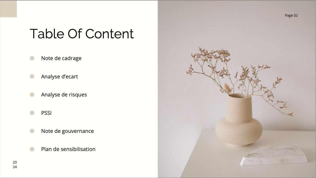 Au long de ce projet, en groupe de 3 personnes, nous avons tout d'abord créé une entreprise fictive de conseil, que nous représenterons dans le cadre de l’intervention. Nous avons étudié les caractéristiques de l’entreprise ciblé et pendant toute la durée du projet nous avons réalisé différents types de documents : note de cadrage, analyse de risques, PSSI…