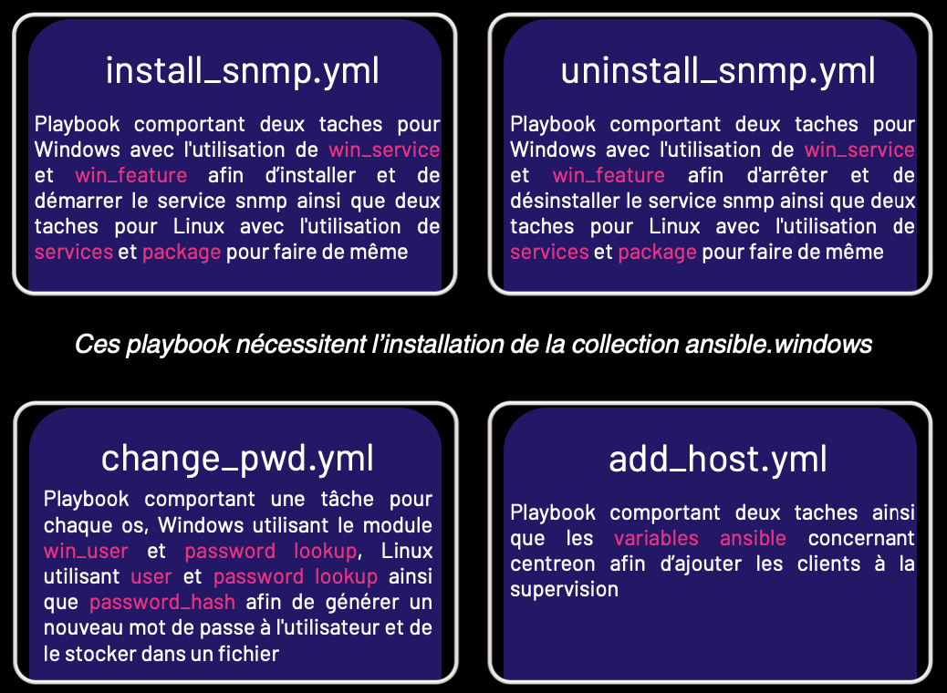 Nous avons exploré de nouveaux logiciels, notamment Centreon et Ansible. Ansible nous a permis de créer des playbooks pour automatiser des actions essentielles, comme l’installation, la configuration et la désinstallation du service SNMP sur des clients Linux et Windows, ainsi que la gestion des hôtes sur Centreon et la génération de mots de passe.