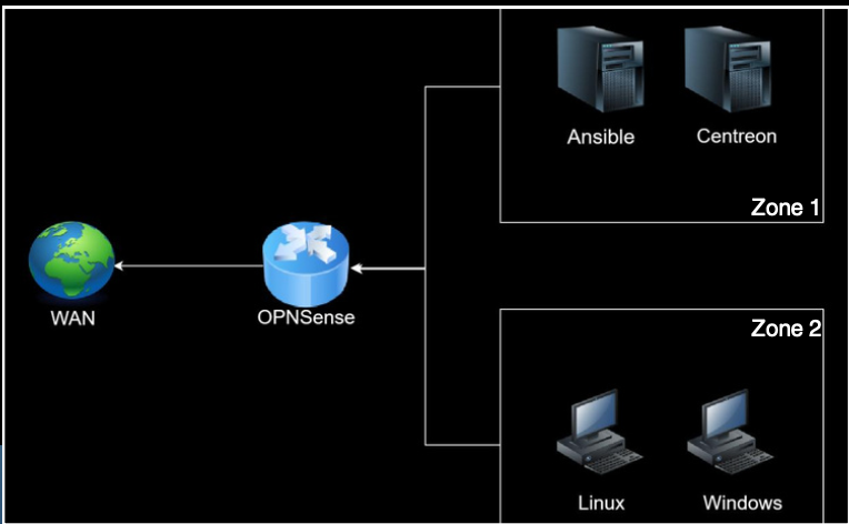 Dans le cadre de ce projet réseau, il était essentiel de continuer à développer nos compétences. Nous avons donc mis en place un réseau composé de différentes machines et automatisé plusieurs actions. Le système était structuré en deux zones distinctes, intégrant des machines telles qu’OPNsense, AlmaLinux et Windows.